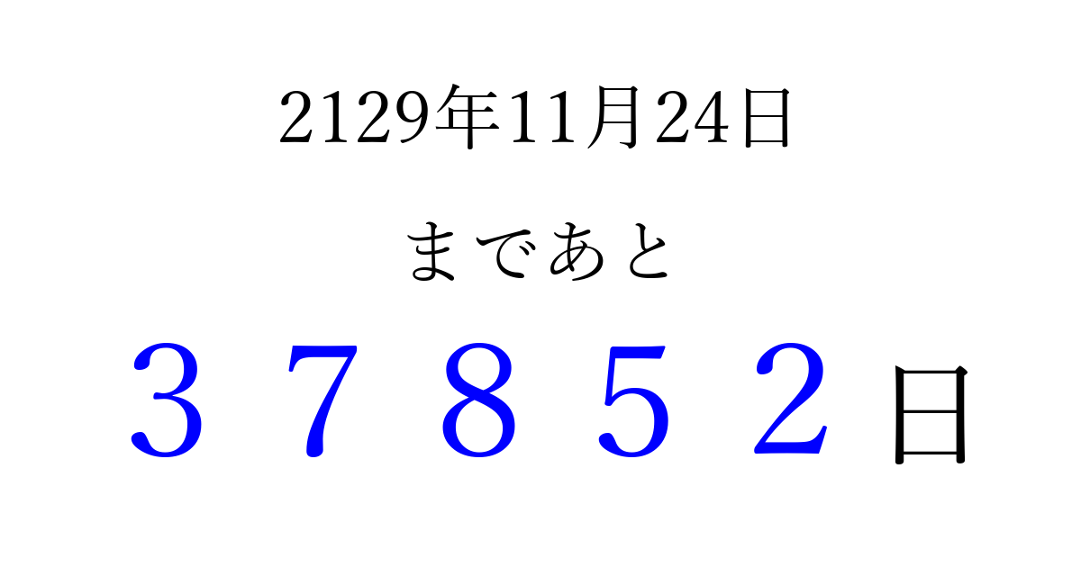 2129年11月24日(木)まで あと 99999 日です 追加すると、トップページからすぐ選べるようになります ※2026/04/06現在の結果です。 最新の状態に更新する ↓シェアして、タイムライン上にカウントダウンを表示しよう!↓ 📤 この結果を共有する Tweet シェア Threads Bluesky 別の日付でカウントダウン 2129年11月のカレンダー このページをブックマークに追加すると、いつでもカウントダウンを確認できます。 (PC: Ctrl+D / Mac: ⌘+D) hitome-notes.comでは以下のページも運営しています。 指定日と期間から日付を計算 | ガチャ確率計算・シミュレーション | プライバシー・ポリシー 運営者:Avocado