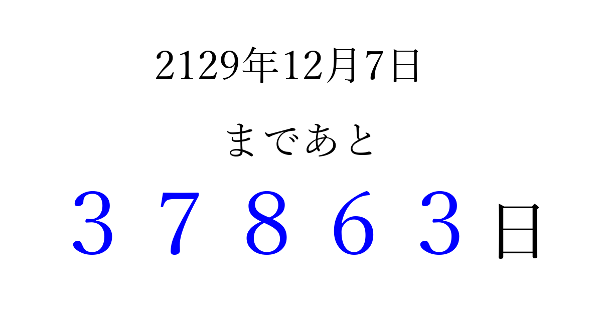 2129年12月7日(水)まで あと 99999 日です 追加すると、トップページからすぐ選べるようになります ※2026/04/08現在の結果です。 最新の状態に更新する ↓シェアして、タイムライン上にカウントダウンを表示しよう!↓ 📤 この結果を共有する Tweet シェア Threads Bluesky 別の日付でカウントダウン 2129年12月のカレンダー このページをブックマークに追加すると、いつでもカウントダウンを確認できます。 (PC: Ctrl+D / Mac: ⌘+D) hitome-notes.comでは以下のページも運営しています。 指定日と期間から日付を計算 | ガチャ確率計算・シミュレーション | プライバシー・ポリシー 運営者:Avocado