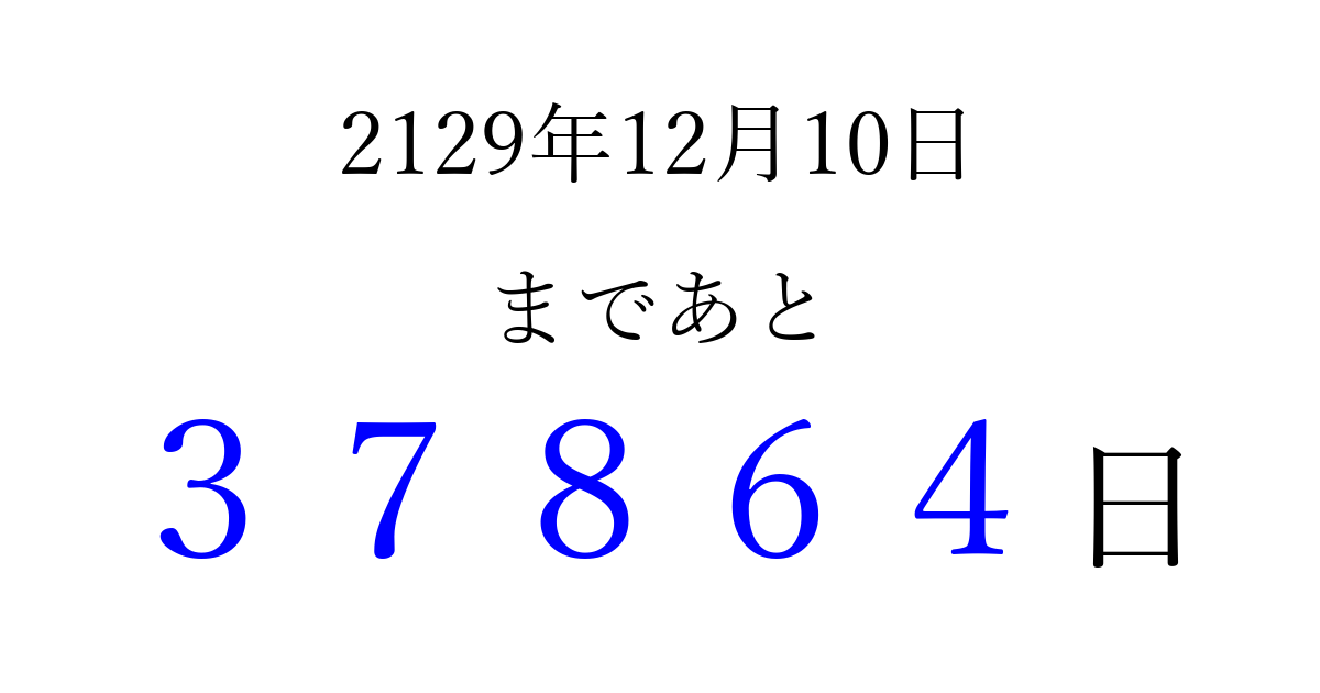 2129年12月10日(土)まで あと 99999 日です 追加すると、トップページからすぐ選べるようになります ※2026/04/10現在の結果です。 最新の状態に更新する ↓シェアして、タイムライン上にカウントダウンを表示しよう!↓ 📤 この結果を共有する Tweet シェア Threads Bluesky 別の日付でカウントダウン 2129年12月のカレンダー このページをブックマークに追加すると、いつでもカウントダウンを確認できます。 (PC: Ctrl+D / Mac: ⌘+D) hitome-notes.comでは以下のページも運営しています。 指定日と期間から日付を計算 | ガチャ確率計算・シミュレーション | プライバシー・ポリシー 運営者:Avocado