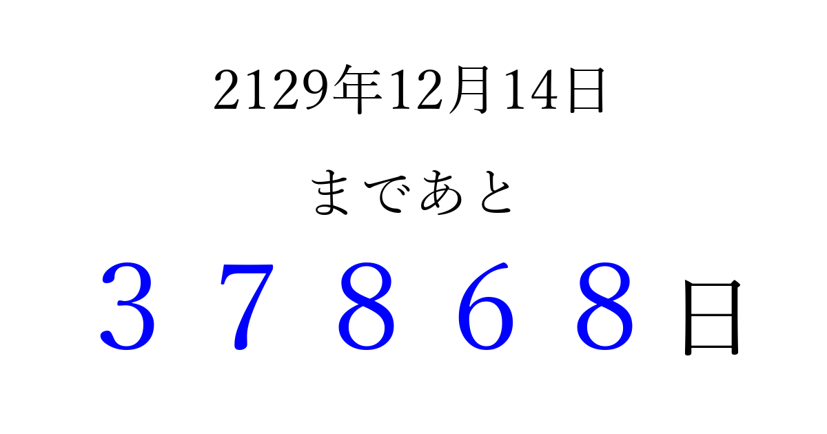 2129年12月14日(水)まで あと 99999 日です 追加すると、トップページからすぐ選べるようになります ※2026/04/10現在の結果です。 最新の状態に更新する ↓シェアして、タイムライン上にカウントダウンを表示しよう!↓ 📤 この結果を共有する Tweet シェア Threads Bluesky 別の日付でカウントダウン 2129年12月のカレンダー このページをブックマークに追加すると、いつでもカウントダウンを確認できます。 (PC: Ctrl+D / Mac: ⌘+D) hitome-notes.comでは以下のページも運営しています。 指定日と期間から日付を計算 | ガチャ確率計算・シミュレーション | プライバシー・ポリシー 運営者:Avocado