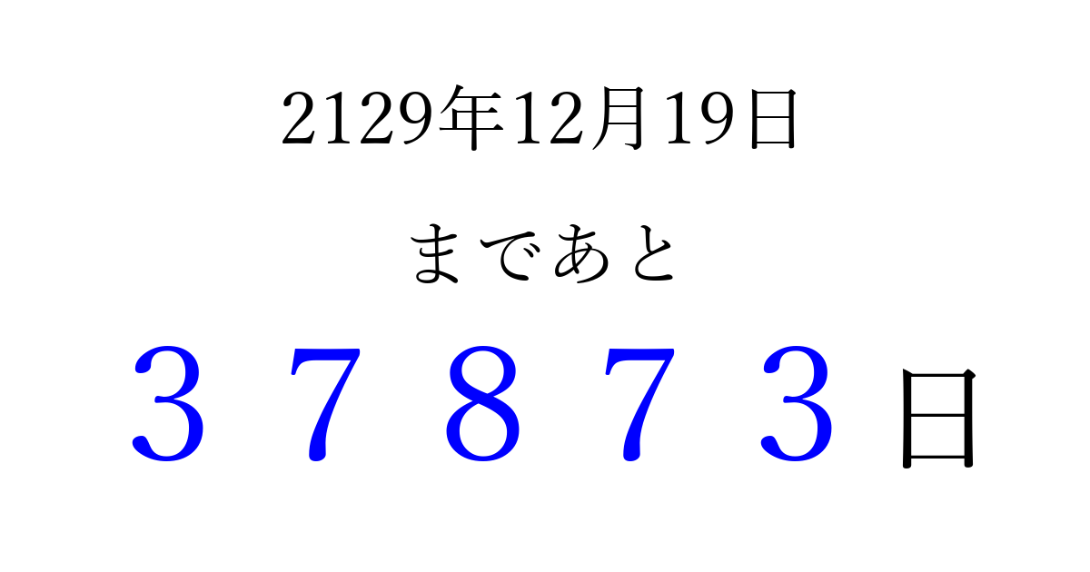2129年12月19日(月)まで あと 99999 日です 追加すると、トップページからすぐ選べるようになります ※2026/04/10現在の結果です。 最新の状態に更新する ↓シェアして、タイムライン上にカウントダウンを表示しよう!↓ 📤 この結果を共有する Tweet シェア Threads Bluesky 別の日付でカウントダウン 2129年12月のカレンダー このページをブックマークに追加すると、いつでもカウントダウンを確認できます。 (PC: Ctrl+D / Mac: ⌘+D) hitome-notes.comでは以下のページも運営しています。 指定日と期間から日付を計算 | ガチャ確率計算・シミュレーション | プライバシー・ポリシー 運営者:Avocado