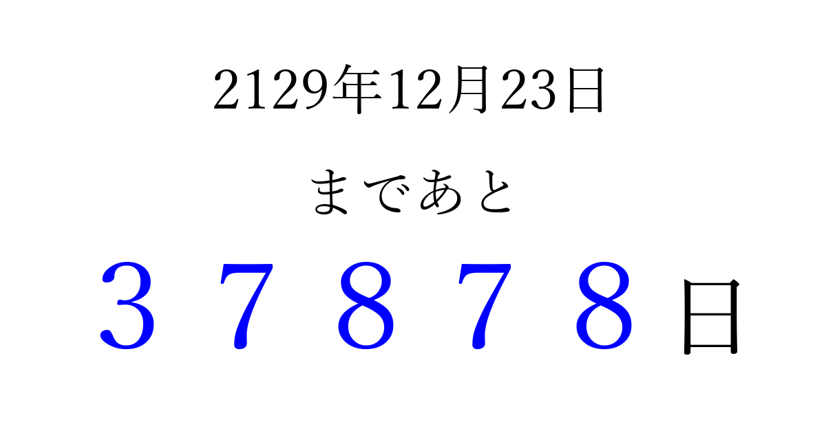 2129年12月23日(金)まで あと 99999 日です 追加すると、トップページからすぐ選べるようになります ※2026/04/09現在の結果です。 最新の状態に更新する ↓シェアして、タイムライン上にカウントダウンを表示しよう!↓ 📤 この結果を共有する Tweet シェア Threads Bluesky 別の日付でカウントダウン 2129年12月のカレンダー このページをブックマークに追加すると、いつでもカウントダウンを確認できます。 (PC: Ctrl+D / Mac: ⌘+D) hitome-notes.comでは以下のページも運営しています。 指定日と期間から日付を計算 | ガチャ確率計算・シミュレーション | プライバシー・ポリシー 運営者:Avocado