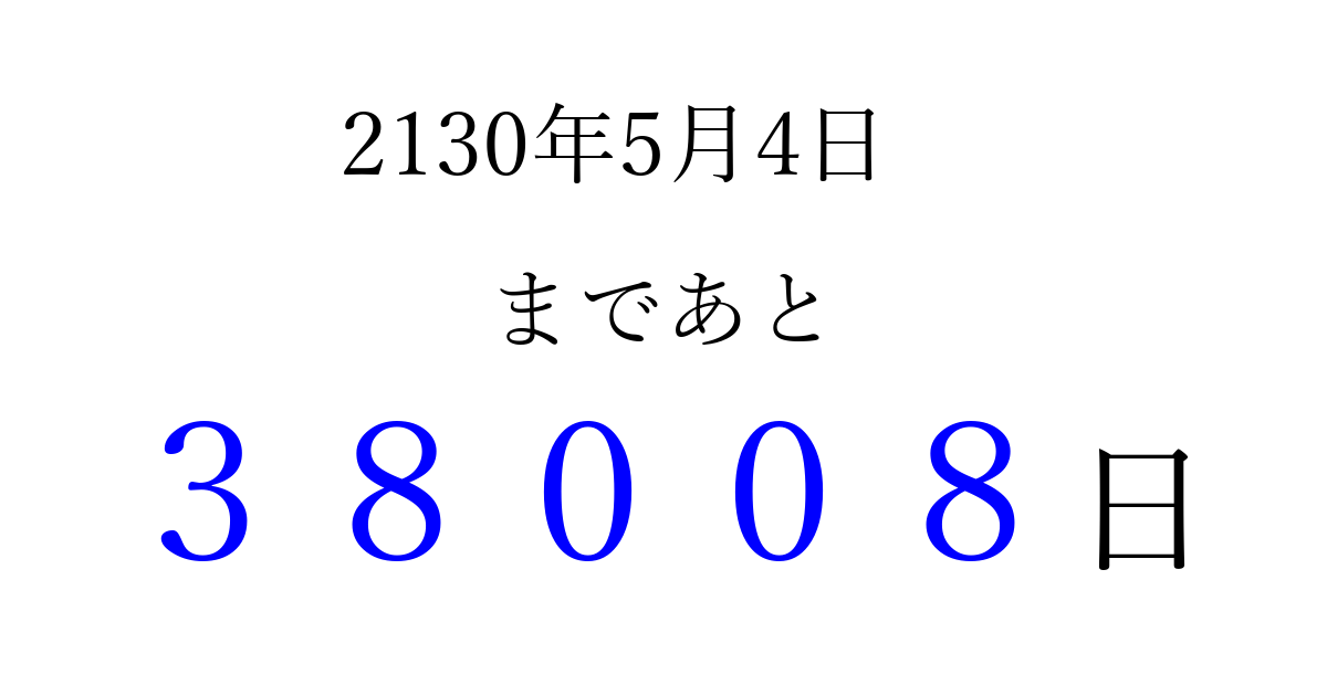 2130年5月4日(木)まで あと 99999 日です 追加すると、トップページからすぐ選べるようになります ※2026/04/11現在の結果です。 最新の状態に更新する ↓シェアして、タイムライン上にカウントダウンを表示しよう!↓ 📤 この結果を共有する Tweet シェア Threads Bluesky 別の日付でカウントダウン 2130年5月のカレンダー このページをブックマークに追加すると、いつでもカウントダウンを確認できます。 (PC: Ctrl+D / Mac: ⌘+D) hitome-notes.comでは以下のページも運営しています。 指定日と期間から日付を計算 | ガチャ確率計算・シミュレーション | プライバシー・ポリシー 運営者:Avocado