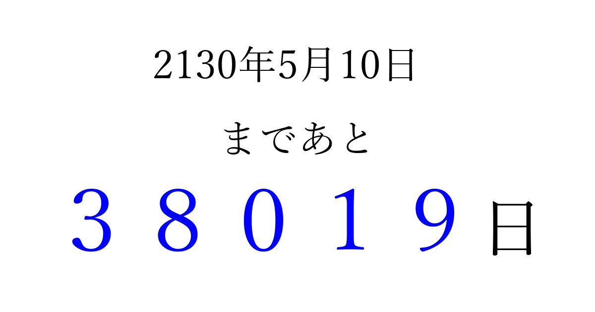 2130年5月10日(水)まで あと 99999 日です 追加すると、トップページからすぐ選べるようになります ※2026/04/06現在の結果です。 最新の状態に更新する ↓シェアして、タイムライン上にカウントダウンを表示しよう!↓ 📤 この結果を共有する Tweet シェア Threads Bluesky 別の日付でカウントダウン 2130年5月のカレンダー このページをブックマークに追加すると、いつでもカウントダウンを確認できます。 (PC: Ctrl+D / Mac: ⌘+D) hitome-notes.comでは以下のページも運営しています。 指定日と期間から日付を計算 | ガチャ確率計算・シミュレーション | プライバシー・ポリシー 運営者:Avocado
