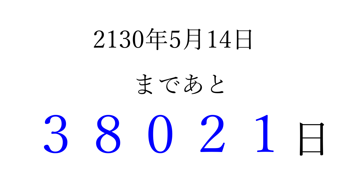 2130年5月14日(日)まで あと 99999 日です 追加すると、トップページからすぐ選べるようになります ※2026/04/08現在の結果です。 最新の状態に更新する ↓シェアして、タイムライン上にカウントダウンを表示しよう!↓ 📤 この結果を共有する Tweet シェア Threads Bluesky 別の日付でカウントダウン 2130年5月のカレンダー このページをブックマークに追加すると、いつでもカウントダウンを確認できます。 (PC: Ctrl+D / Mac: ⌘+D) hitome-notes.comでは以下のページも運営しています。 指定日と期間から日付を計算 | ガチャ確率計算・シミュレーション | プライバシー・ポリシー 運営者:Avocado