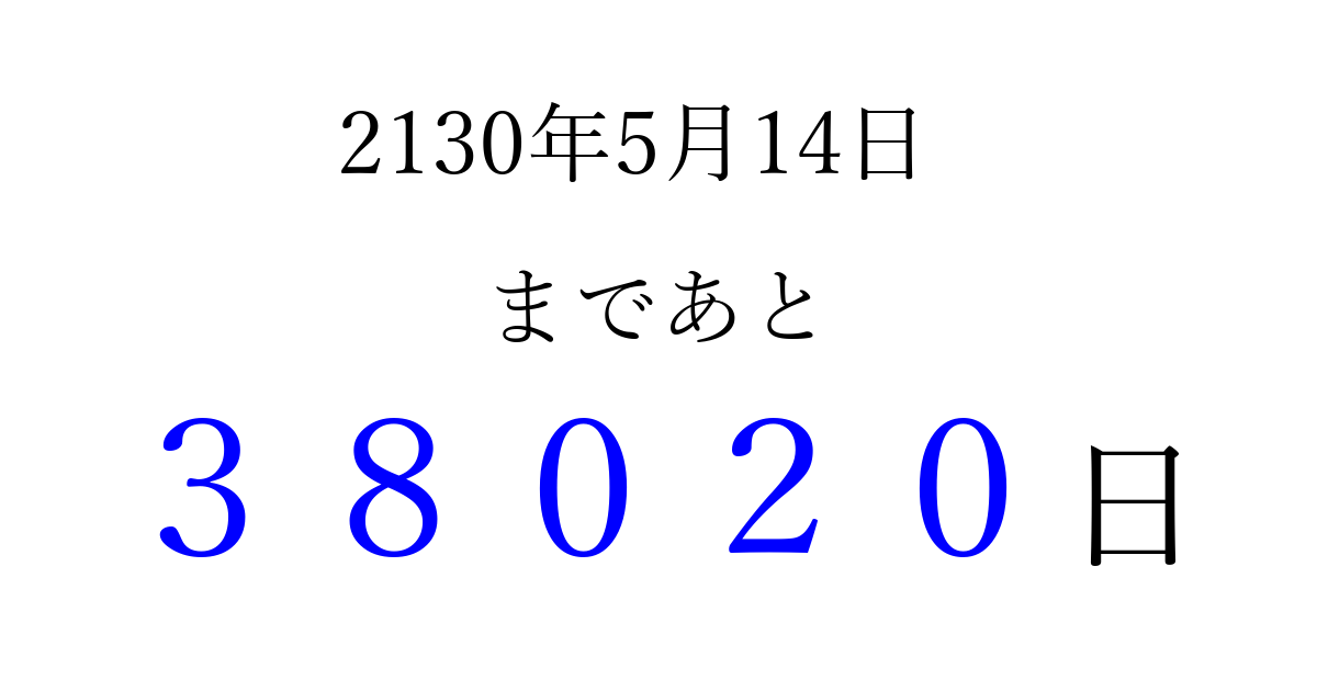 2130年5月14日(日)まで あと 99999 日です 追加すると、トップページからすぐ選べるようになります ※2026/04/09現在の結果です。 最新の状態に更新する ↓シェアして、タイムライン上にカウントダウンを表示しよう!↓ 📤 この結果を共有する Tweet シェア Threads Bluesky 別の日付でカウントダウン 2130年5月のカレンダー このページをブックマークに追加すると、いつでもカウントダウンを確認できます。 (PC: Ctrl+D / Mac: ⌘+D) hitome-notes.comでは以下のページも運営しています。 指定日と期間から日付を計算 | ガチャ確率計算・シミュレーション | プライバシー・ポリシー 運営者:Avocado