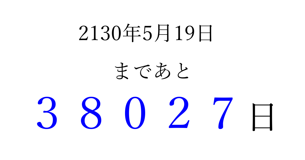 2130年5月19日(金)まで あと 99999 日です 追加すると、トップページからすぐ選べるようになります ※2026/04/07現在の結果です。 最新の状態に更新する ↓シェアして、タイムライン上にカウントダウンを表示しよう!↓ 📤 この結果を共有する Tweet シェア Threads Bluesky 別の日付でカウントダウン 2130年5月のカレンダー このページをブックマークに追加すると、いつでもカウントダウンを確認できます。 (PC: Ctrl+D / Mac: ⌘+D) hitome-notes.comでは以下のページも運営しています。 指定日と期間から日付を計算 | ガチャ確率計算・シミュレーション | プライバシー・ポリシー 運営者:Avocado