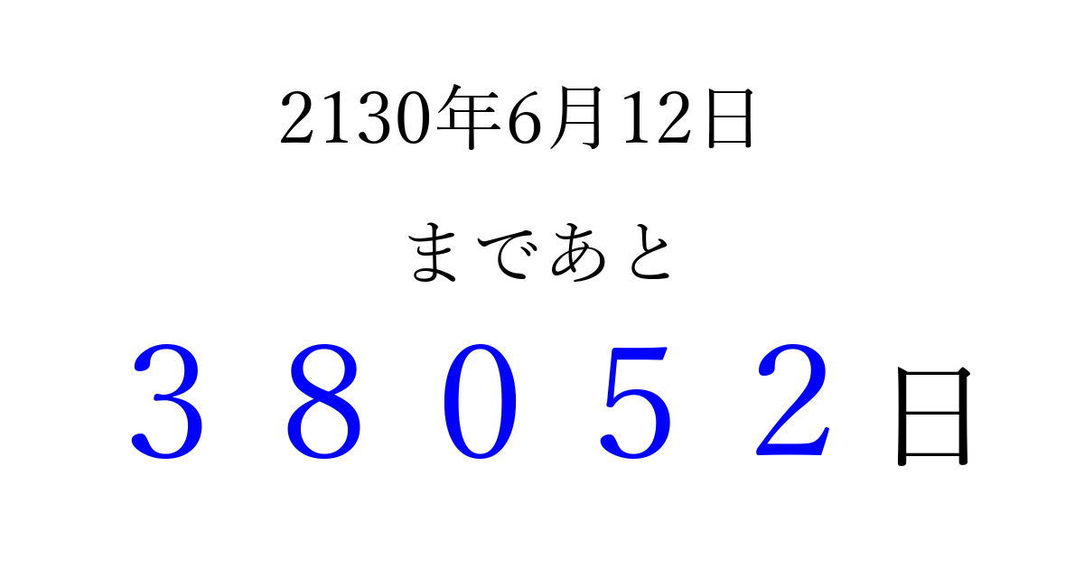 2130年6月12日(月)まで あと 99999 日です 追加すると、トップページからすぐ選べるようになります ※2026/04/06現在の結果です。 最新の状態に更新する ↓シェアして、タイムライン上にカウントダウンを表示しよう!↓ 📤 この結果を共有する Tweet シェア Threads Bluesky 別の日付でカウントダウン 2130年6月のカレンダー このページをブックマークに追加すると、いつでもカウントダウンを確認できます。 (PC: Ctrl+D / Mac: ⌘+D) hitome-notes.comでは以下のページも運営しています。 指定日と期間から日付を計算 | ガチャ確率計算・シミュレーション | プライバシー・ポリシー 運営者:Avocado