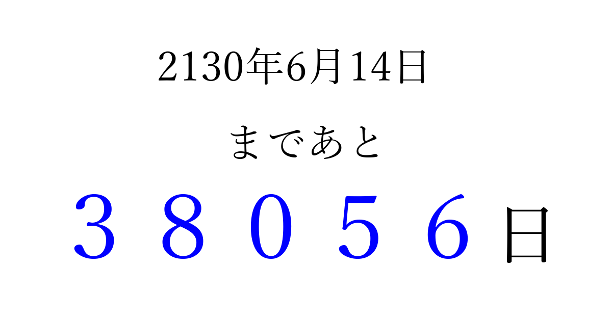 2130年6月14日(水)まで あと 99999 日です 追加すると、トップページからすぐ選べるようになります ※2026/04/04現在の結果です。 最新の状態に更新する ↓シェアして、タイムライン上にカウントダウンを表示しよう!↓ 📤 この結果を共有する Tweet シェア Threads Bluesky 別の日付でカウントダウン 2130年6月のカレンダー このページをブックマークに追加すると、いつでもカウントダウンを確認できます。 (PC: Ctrl+D / Mac: ⌘+D) hitome-notes.comでは以下のページも運営しています。 指定日と期間から日付を計算 | ガチャ確率計算・シミュレーション | プライバシー・ポリシー 運営者:Avocado