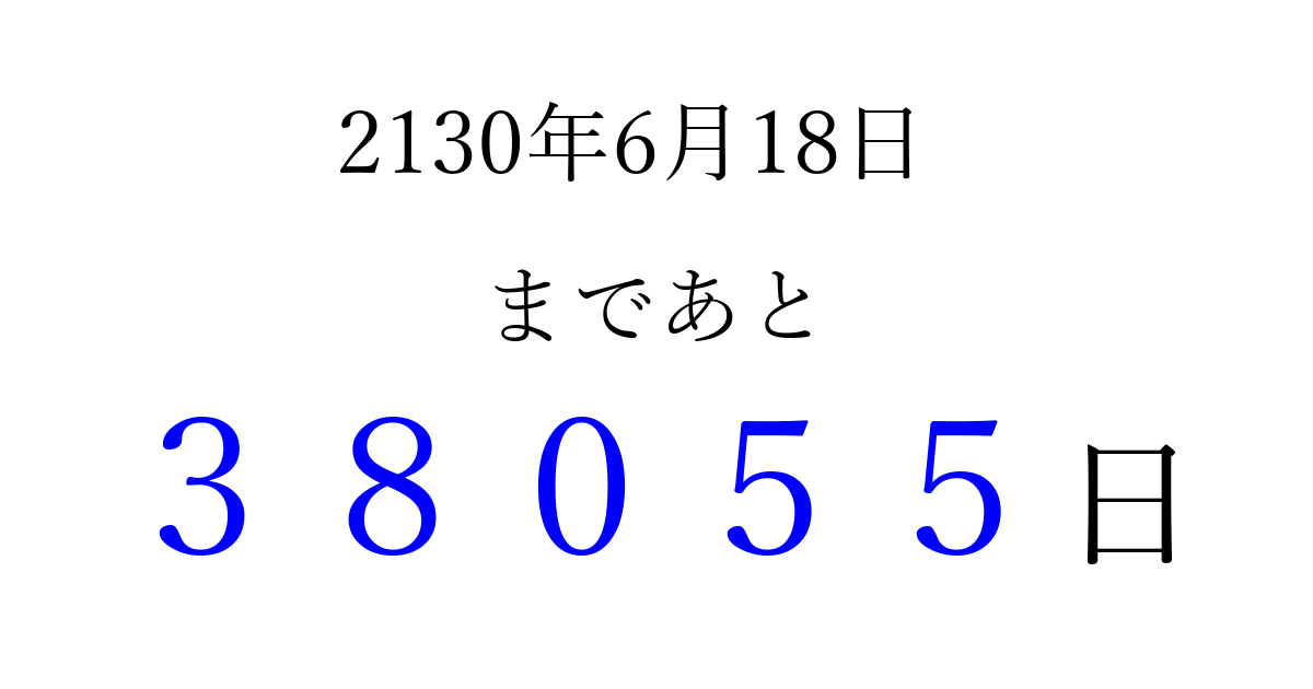 2130年6月18日(日)まで あと 99999 日です 追加すると、トップページからすぐ選べるようになります ※2026/04/09現在の結果です。 最新の状態に更新する ↓シェアして、タイムライン上にカウントダウンを表示しよう!↓ 📤 この結果を共有する Tweet シェア Threads Bluesky 別の日付でカウントダウン 2130年6月のカレンダー このページをブックマークに追加すると、いつでもカウントダウンを確認できます。 (PC: Ctrl+D / Mac: ⌘+D) hitome-notes.comでは以下のページも運営しています。 指定日と期間から日付を計算 | ガチャ確率計算・シミュレーション | プライバシー・ポリシー 運営者:Avocado