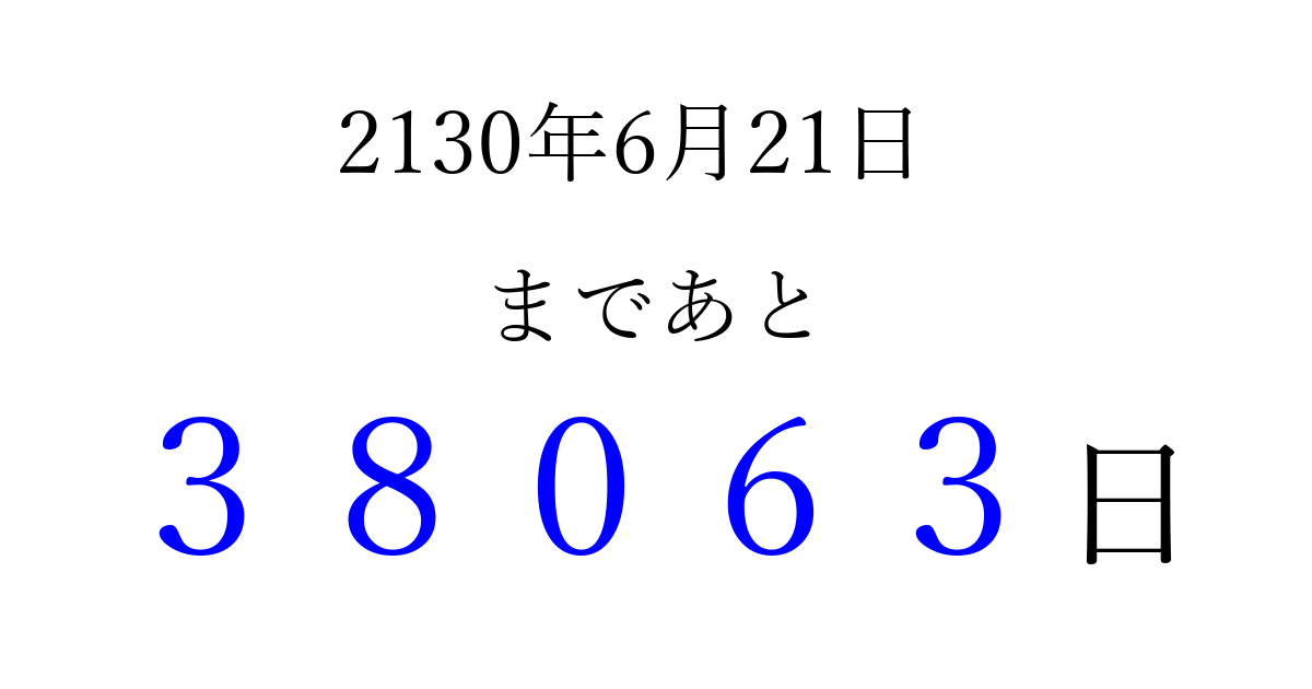 2130年6月21日(水)まで あと 99999 日です 追加すると、トップページからすぐ選べるようになります ※2026/04/04現在の結果です。 最新の状態に更新する ↓シェアして、タイムライン上にカウントダウンを表示しよう!↓ 📤 この結果を共有する Tweet シェア Threads Bluesky 別の日付でカウントダウン 2130年6月のカレンダー このページをブックマークに追加すると、いつでもカウントダウンを確認できます。 (PC: Ctrl+D / Mac: ⌘+D) hitome-notes.comでは以下のページも運営しています。 指定日と期間から日付を計算 | ガチャ確率計算・シミュレーション | プライバシー・ポリシー 運営者:Avocado