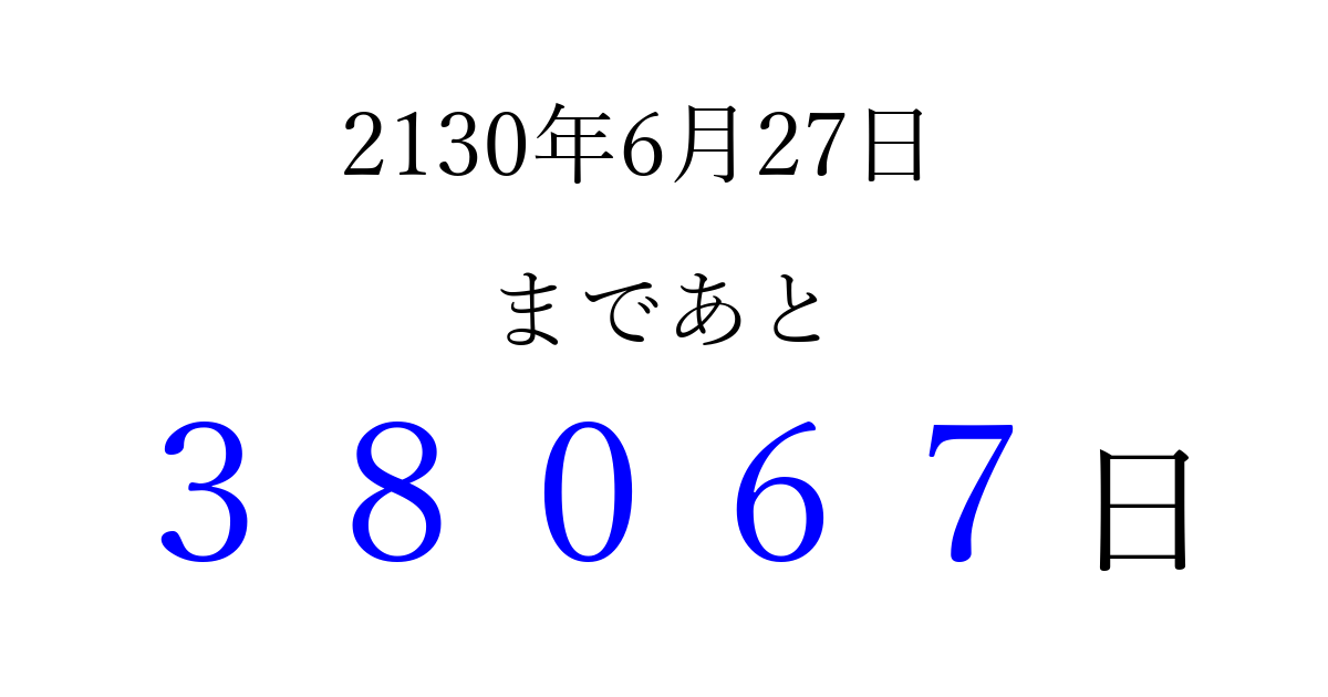 2130年6月27日(火)まで あと 99999 日です 追加すると、トップページからすぐ選べるようになります ※2026/04/06現在の結果です。 最新の状態に更新する ↓シェアして、タイムライン上にカウントダウンを表示しよう!↓ 📤 この結果を共有する Tweet シェア Threads Bluesky 別の日付でカウントダウン 2130年6月のカレンダー このページをブックマークに追加すると、いつでもカウントダウンを確認できます。 (PC: Ctrl+D / Mac: ⌘+D) hitome-notes.comでは以下のページも運営しています。 指定日と期間から日付を計算 | ガチャ確率計算・シミュレーション | プライバシー・ポリシー 運営者:Avocado
