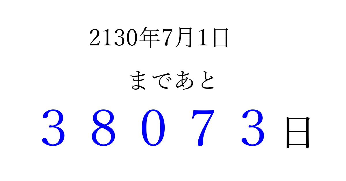 2130年7月1日(土)まで あと 99999 日です 追加すると、トップページからすぐ選べるようになります ※2026/04/04現在の結果です。 最新の状態に更新する ↓シェアして、タイムライン上にカウントダウンを表示しよう!↓ 📤 この結果を共有する Tweet シェア Threads Bluesky 別の日付でカウントダウン 2130年7月のカレンダー このページをブックマークに追加すると、いつでもカウントダウンを確認できます。 (PC: Ctrl+D / Mac: ⌘+D) hitome-notes.comでは以下のページも運営しています。 指定日と期間から日付を計算 | ガチャ確率計算・シミュレーション | プライバシー・ポリシー 運営者:Avocado