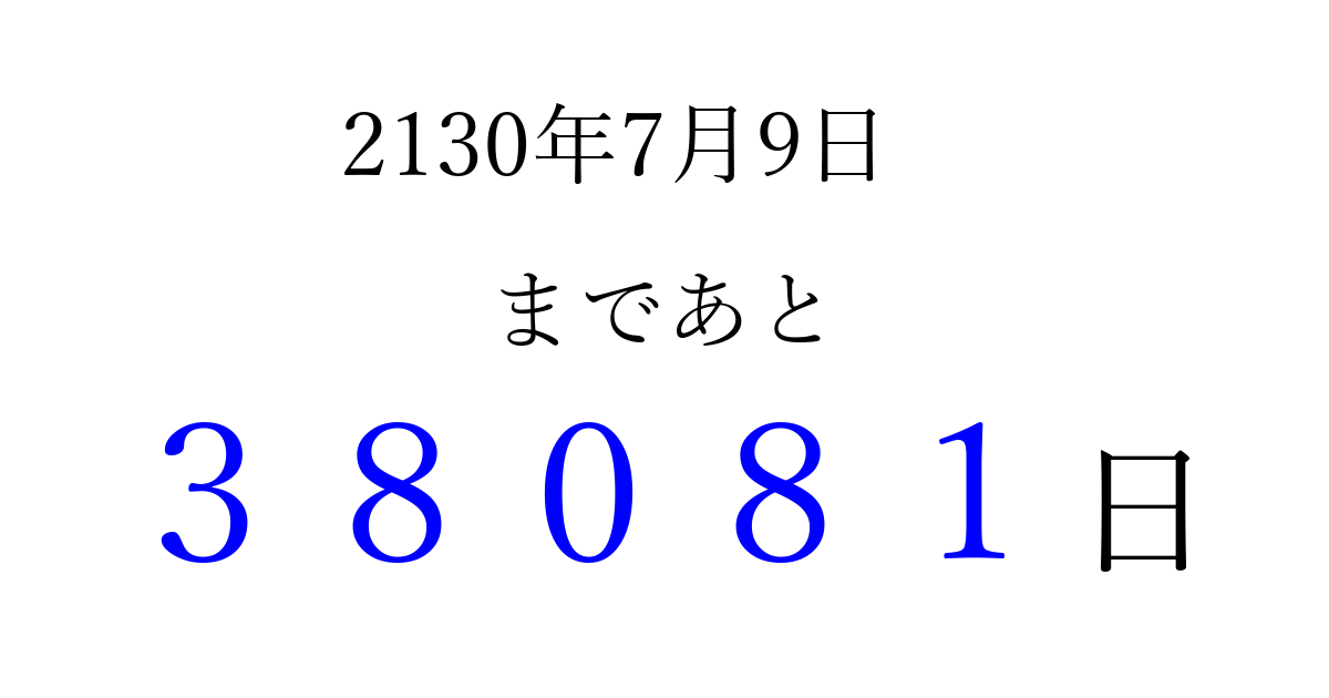 2130年7月9日(日)まで あと 99999 日です 追加すると、トップページからすぐ選べるようになります ※2026/04/04現在の結果です。 最新の状態に更新する ↓シェアして、タイムライン上にカウントダウンを表示しよう!↓ 📤 この結果を共有する Tweet シェア Threads Bluesky 別の日付でカウントダウン 2130年7月のカレンダー このページをブックマークに追加すると、いつでもカウントダウンを確認できます。 (PC: Ctrl+D / Mac: ⌘+D) hitome-notes.comでは以下のページも運営しています。 指定日と期間から日付を計算 | ガチャ確率計算・シミュレーション | プライバシー・ポリシー 運営者:Avocado