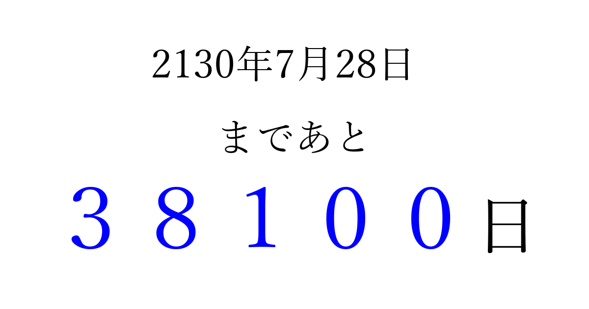 2130年7月28日(金)まで あと 99999 日です 追加すると、トップページからすぐ選べるようになります ※2026/04/04現在の結果です。 最新の状態に更新する ↓シェアして、タイムライン上にカウントダウンを表示しよう!↓ 📤 この結果を共有する Tweet シェア Threads Bluesky 別の日付でカウントダウン 2130年7月のカレンダー このページをブックマークに追加すると、いつでもカウントダウンを確認できます。 (PC: Ctrl+D / Mac: ⌘+D) hitome-notes.comでは以下のページも運営しています。 指定日と期間から日付を計算 | ガチャ確率計算・シミュレーション | プライバシー・ポリシー 運営者:Avocado