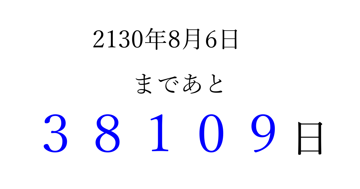 2130年8月6日(日)まで あと 99999 日です 追加すると、トップページからすぐ選べるようになります ※2026/04/04現在の結果です。 最新の状態に更新する ↓シェアして、タイムライン上にカウントダウンを表示しよう!↓ 📤 この結果を共有する Tweet シェア Threads Bluesky 別の日付でカウントダウン 2130年8月のカレンダー このページをブックマークに追加すると、いつでもカウントダウンを確認できます。 (PC: Ctrl+D / Mac: ⌘+D) hitome-notes.comでは以下のページも運営しています。 指定日と期間から日付を計算 | ガチャ確率計算・シミュレーション | プライバシー・ポリシー 運営者:Avocado