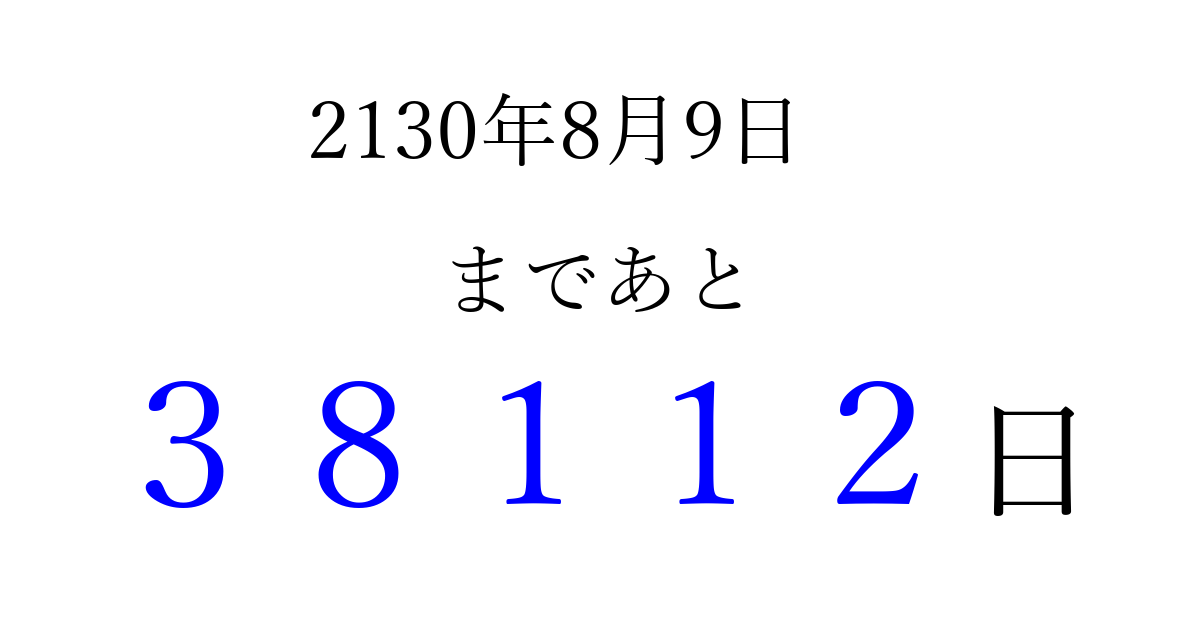 2130年8月9日(水)まで あと 99999 日です 追加すると、トップページからすぐ選べるようになります ※2026/04/04現在の結果です。 最新の状態に更新する ↓シェアして、タイムライン上にカウントダウンを表示しよう!↓ 📤 この結果を共有する Tweet シェア Threads Bluesky 別の日付でカウントダウン 2130年8月のカレンダー このページをブックマークに追加すると、いつでもカウントダウンを確認できます。 (PC: Ctrl+D / Mac: ⌘+D) hitome-notes.comでは以下のページも運営しています。 指定日と期間から日付を計算 | ガチャ確率計算・シミュレーション | プライバシー・ポリシー 運営者:Avocado