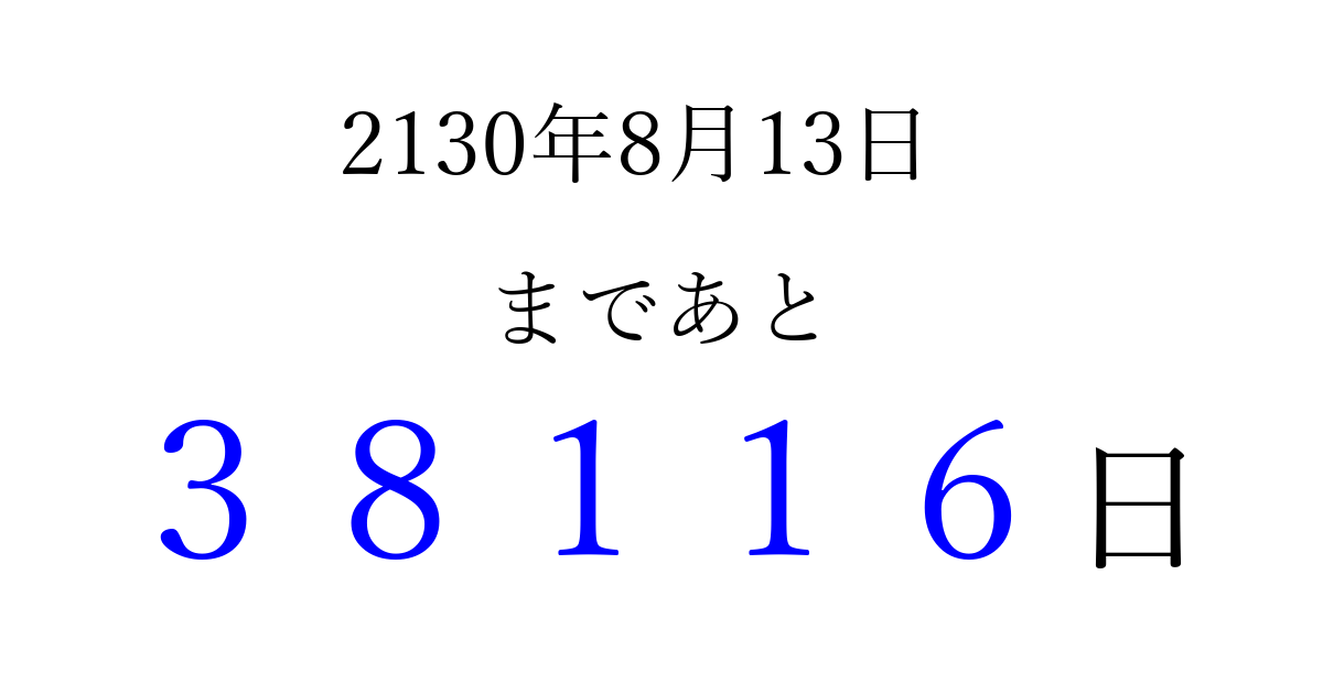2130年8月13日(日)まで あと 99999 日です 追加すると、トップページからすぐ選べるようになります ※2026/04/04現在の結果です。 最新の状態に更新する ↓シェアして、タイムライン上にカウントダウンを表示しよう!↓ 📤 この結果を共有する Tweet シェア Threads Bluesky 別の日付でカウントダウン 2130年8月のカレンダー このページをブックマークに追加すると、いつでもカウントダウンを確認できます。 (PC: Ctrl+D / Mac: ⌘+D) hitome-notes.comでは以下のページも運営しています。 指定日と期間から日付を計算 | ガチャ確率計算・シミュレーション | プライバシー・ポリシー 運営者:Avocado