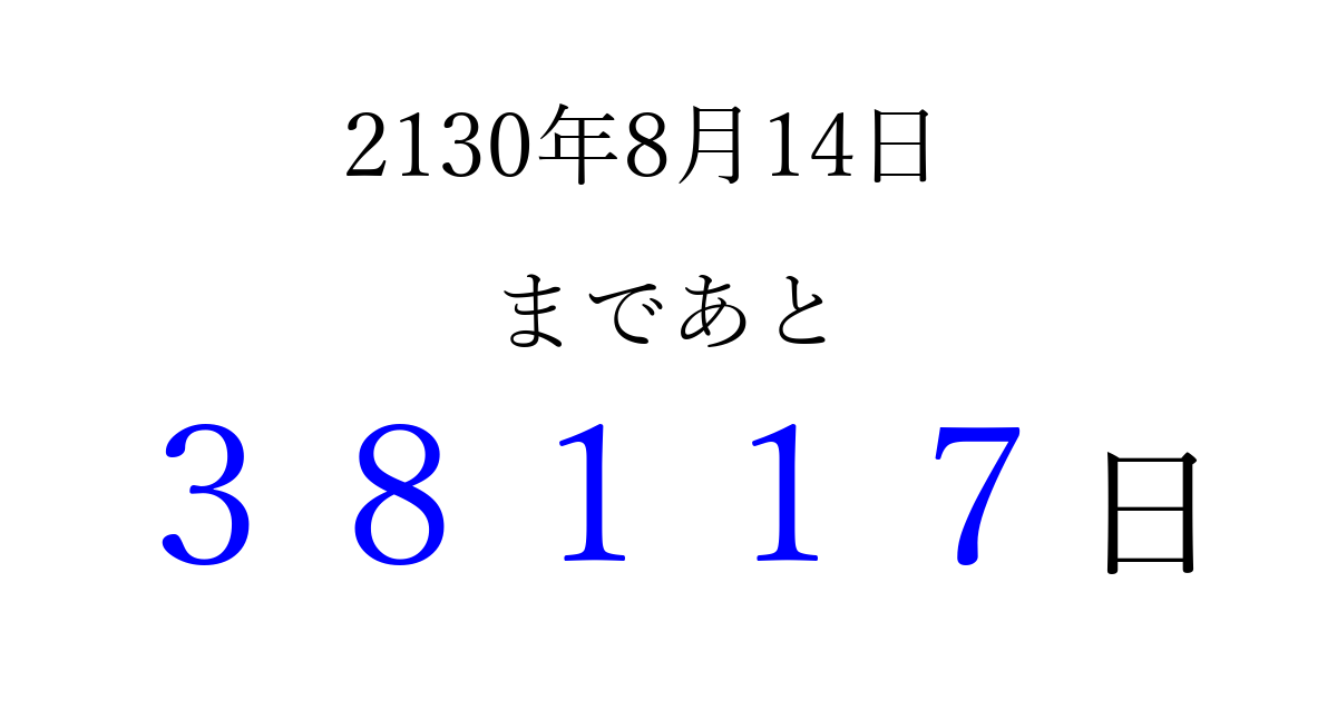 2130年8月14日(月)まで あと 99999 日です 追加すると、トップページからすぐ選べるようになります ※2026/04/04現在の結果です。 最新の状態に更新する ↓シェアして、タイムライン上にカウントダウンを表示しよう!↓ 📤 この結果を共有する Tweet シェア Threads Bluesky 別の日付でカウントダウン 2130年8月のカレンダー このページをブックマークに追加すると、いつでもカウントダウンを確認できます。 (PC: Ctrl+D / Mac: ⌘+D) hitome-notes.comでは以下のページも運営しています。 指定日と期間から日付を計算 | ガチャ確率計算・シミュレーション | プライバシー・ポリシー 運営者:Avocado