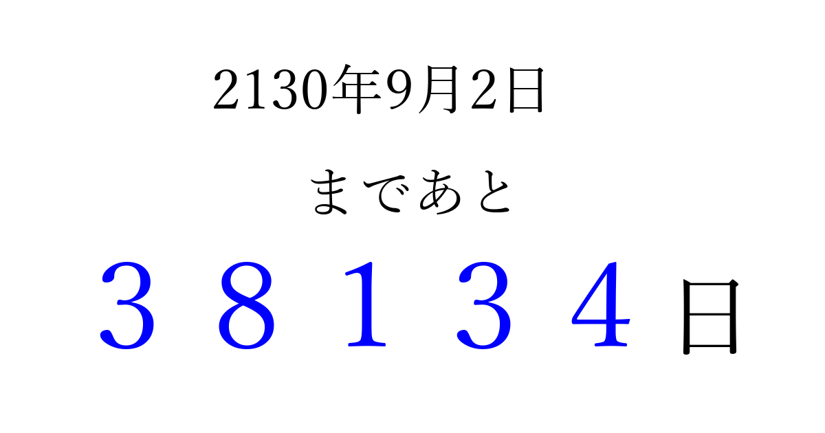 2130年9月2日(土)まで あと 99999 日です 追加すると、トップページからすぐ選べるようになります ※2026/04/06現在の結果です。 最新の状態に更新する ↓シェアして、タイムライン上にカウントダウンを表示しよう!↓ 📤 この結果を共有する Tweet シェア Threads Bluesky 別の日付でカウントダウン 2130年9月のカレンダー このページをブックマークに追加すると、いつでもカウントダウンを確認できます。 (PC: Ctrl+D / Mac: ⌘+D) hitome-notes.comでは以下のページも運営しています。 指定日と期間から日付を計算 | ガチャ確率計算・シミュレーション | プライバシー・ポリシー 運営者:Avocado