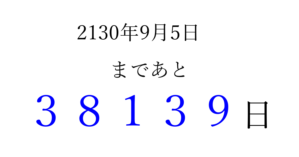 2130年9月5日(火)まで あと 99999 日です 追加すると、トップページからすぐ選べるようになります ※2026/04/04現在の結果です。 最新の状態に更新する ↓シェアして、タイムライン上にカウントダウンを表示しよう!↓ 📤 この結果を共有する Tweet シェア Threads Bluesky 別の日付でカウントダウン 2130年9月のカレンダー このページをブックマークに追加すると、いつでもカウントダウンを確認できます。 (PC: Ctrl+D / Mac: ⌘+D) hitome-notes.comでは以下のページも運営しています。 指定日と期間から日付を計算 | ガチャ確率計算・シミュレーション | プライバシー・ポリシー 運営者:Avocado