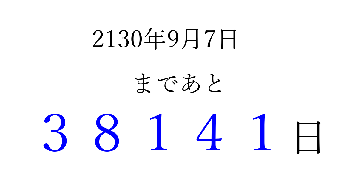 2130年9月7日(木)まで あと 99999 日です 追加すると、トップページからすぐ選べるようになります ※2026/04/04現在の結果です。 最新の状態に更新する ↓シェアして、タイムライン上にカウントダウンを表示しよう!↓ 📤 この結果を共有する Tweet シェア Threads Bluesky 別の日付でカウントダウン 2130年9月のカレンダー このページをブックマークに追加すると、いつでもカウントダウンを確認できます。 (PC: Ctrl+D / Mac: ⌘+D) hitome-notes.comでは以下のページも運営しています。 指定日と期間から日付を計算 | ガチャ確率計算・シミュレーション | プライバシー・ポリシー 運営者:Avocado