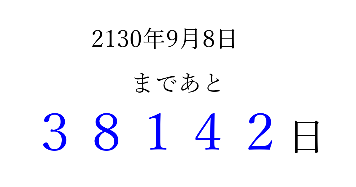 2130年9月8日(金)まで あと 99999 日です 追加すると、トップページからすぐ選べるようになります ※2026/04/04現在の結果です。 最新の状態に更新する ↓シェアして、タイムライン上にカウントダウンを表示しよう!↓ 📤 この結果を共有する Tweet シェア Threads Bluesky 別の日付でカウントダウン 2130年9月のカレンダー このページをブックマークに追加すると、いつでもカウントダウンを確認できます。 (PC: Ctrl+D / Mac: ⌘+D) hitome-notes.comでは以下のページも運営しています。 指定日と期間から日付を計算 | ガチャ確率計算・シミュレーション | プライバシー・ポリシー 運営者:Avocado
