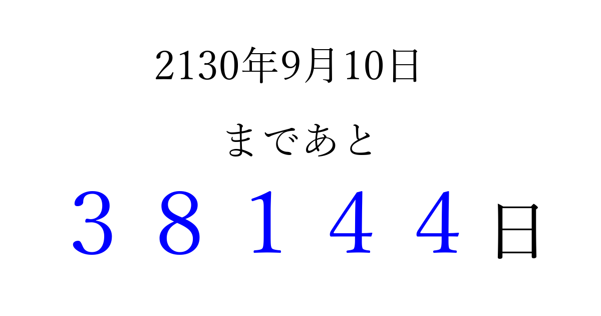 2130年9月10日(日)まで あと 99999 日です 追加すると、トップページからすぐ選べるようになります ※2026/04/04現在の結果です。 最新の状態に更新する ↓シェアして、タイムライン上にカウントダウンを表示しよう!↓ 📤 この結果を共有する Tweet シェア Threads Bluesky 別の日付でカウントダウン 2130年9月のカレンダー このページをブックマークに追加すると、いつでもカウントダウンを確認できます。 (PC: Ctrl+D / Mac: ⌘+D) hitome-notes.comでは以下のページも運営しています。 指定日と期間から日付を計算 | ガチャ確率計算・シミュレーション | プライバシー・ポリシー 運営者:Avocado