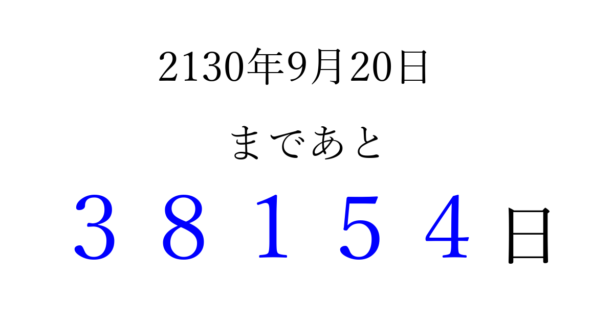 2130年9月20日(水)まで あと 99999 日です 追加すると、トップページからすぐ選べるようになります ※2026/04/04現在の結果です。 最新の状態に更新する ↓シェアして、タイムライン上にカウントダウンを表示しよう!↓ 📤 この結果を共有する Tweet シェア Threads Bluesky 別の日付でカウントダウン 2130年9月のカレンダー このページをブックマークに追加すると、いつでもカウントダウンを確認できます。 (PC: Ctrl+D / Mac: ⌘+D) hitome-notes.comでは以下のページも運営しています。 指定日と期間から日付を計算 | ガチャ確率計算・シミュレーション | プライバシー・ポリシー 運営者:Avocado