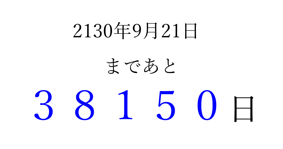 2130年9月21日(木)まで あと 99999 日です 追加すると、トップページからすぐ選べるようになります ※2026/04/09現在の結果です。 最新の状態に更新する ↓シェアして、タイムライン上にカウントダウンを表示しよう!↓ 📤 この結果を共有する Tweet シェア Threads Bluesky 別の日付でカウントダウン 2130年9月のカレンダー このページをブックマークに追加すると、いつでもカウントダウンを確認できます。 (PC: Ctrl+D / Mac: ⌘+D) hitome-notes.comでは以下のページも運営しています。 指定日と期間から日付を計算 | ガチャ確率計算・シミュレーション | プライバシー・ポリシー 運営者:Avocado