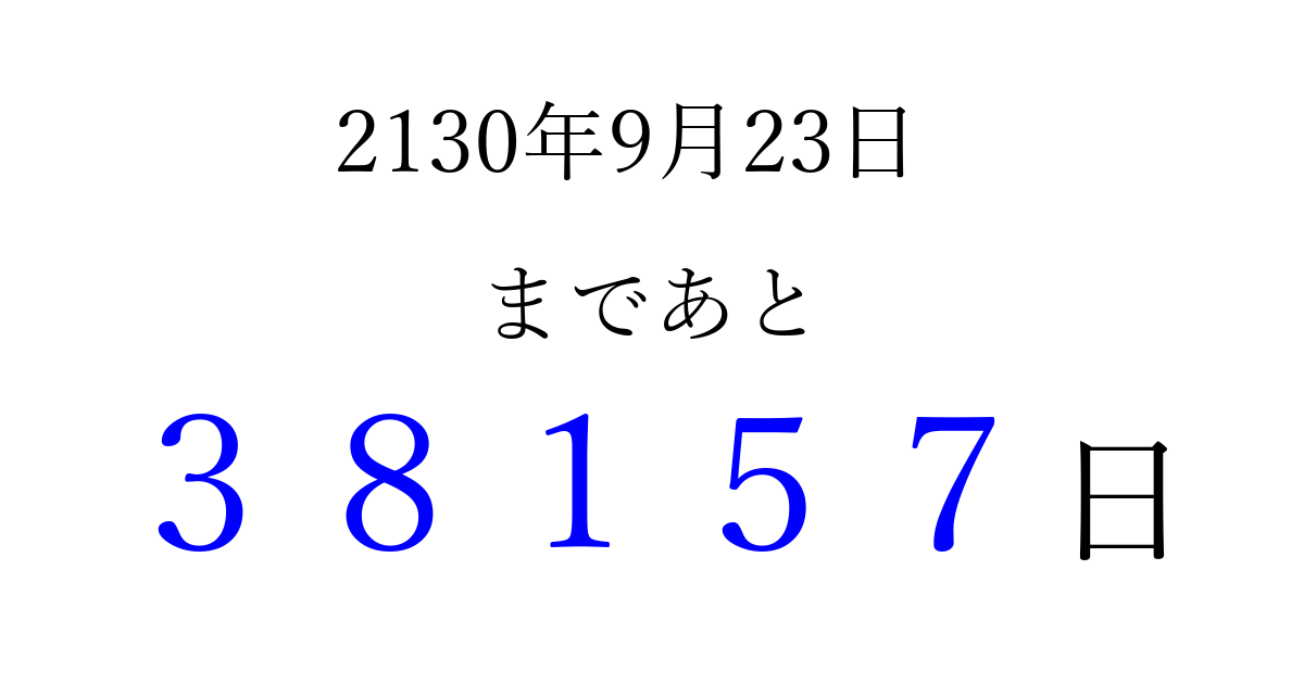2130年9月23日(土)まで あと 99999 日です 追加すると、トップページからすぐ選べるようになります ※2026/04/04現在の結果です。 最新の状態に更新する ↓シェアして、タイムライン上にカウントダウンを表示しよう!↓ 📤 この結果を共有する Tweet シェア Threads Bluesky 別の日付でカウントダウン 2130年9月のカレンダー このページをブックマークに追加すると、いつでもカウントダウンを確認できます。 (PC: Ctrl+D / Mac: ⌘+D) hitome-notes.comでは以下のページも運営しています。 指定日と期間から日付を計算 | ガチャ確率計算・シミュレーション | プライバシー・ポリシー 運営者:Avocado