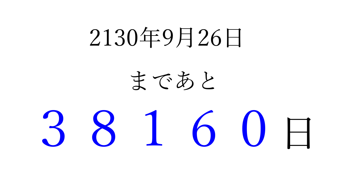 2130年9月26日(火)まで あと 99999 日です 追加すると、トップページからすぐ選べるようになります ※2026/04/04現在の結果です。 最新の状態に更新する ↓シェアして、タイムライン上にカウントダウンを表示しよう!↓ 📤 この結果を共有する Tweet シェア Threads Bluesky 別の日付でカウントダウン 2130年9月のカレンダー このページをブックマークに追加すると、いつでもカウントダウンを確認できます。 (PC: Ctrl+D / Mac: ⌘+D) hitome-notes.comでは以下のページも運営しています。 指定日と期間から日付を計算 | ガチャ確率計算・シミュレーション | プライバシー・ポリシー 運営者:Avocado