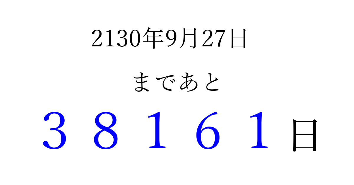 2130年9月27日(水)まで あと 99999 日です 追加すると、トップページからすぐ選べるようになります ※2026/04/04現在の結果です。 最新の状態に更新する ↓シェアして、タイムライン上にカウントダウンを表示しよう!↓ 📤 この結果を共有する Tweet シェア Threads Bluesky 別の日付でカウントダウン 2130年9月のカレンダー このページをブックマークに追加すると、いつでもカウントダウンを確認できます。 (PC: Ctrl+D / Mac: ⌘+D) hitome-notes.comでは以下のページも運営しています。 指定日と期間から日付を計算 | ガチャ確率計算・シミュレーション | プライバシー・ポリシー 運営者:Avocado
