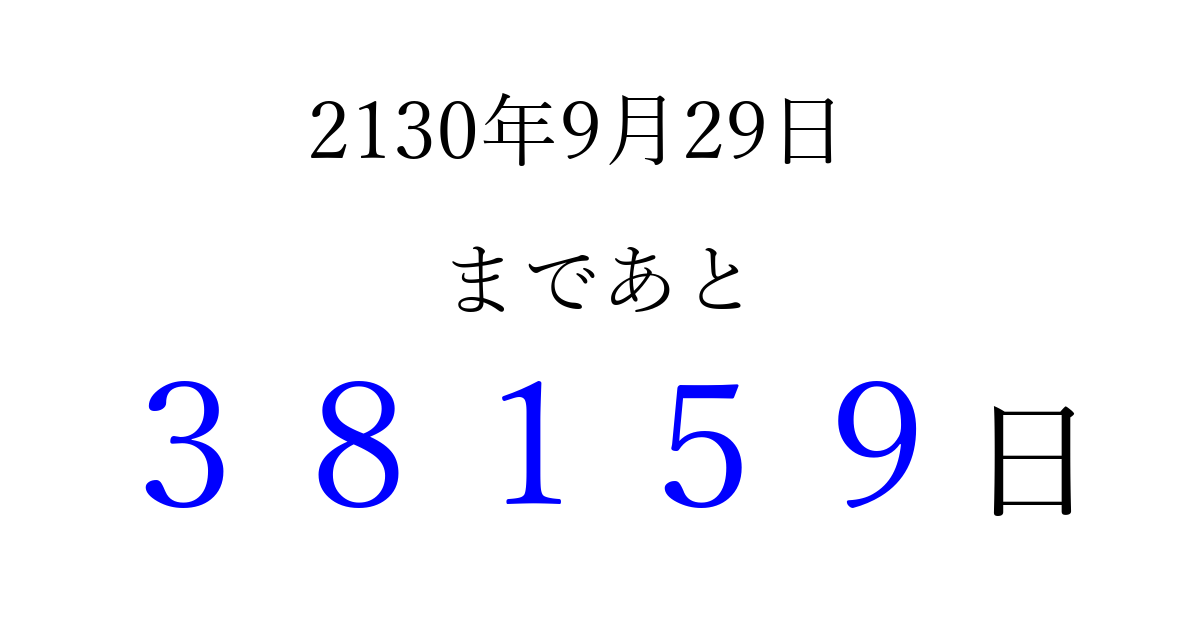 2130年9月29日(金)まで あと 99999 日です 追加すると、トップページからすぐ選べるようになります ※2026/04/08現在の結果です。 最新の状態に更新する ↓シェアして、タイムライン上にカウントダウンを表示しよう!↓ 📤 この結果を共有する Tweet シェア Threads Bluesky 別の日付でカウントダウン 2130年9月のカレンダー このページをブックマークに追加すると、いつでもカウントダウンを確認できます。 (PC: Ctrl+D / Mac: ⌘+D) hitome-notes.comでは以下のページも運営しています。 指定日と期間から日付を計算 | ガチャ確率計算・シミュレーション | プライバシー・ポリシー 運営者:Avocado