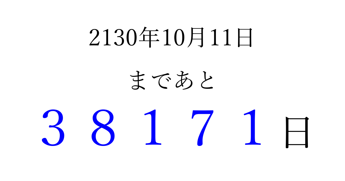 2130年10月11日(水)まで あと 99999 日です 追加すると、トップページからすぐ選べるようになります ※2026/04/08現在の結果です。 最新の状態に更新する ↓シェアして、タイムライン上にカウントダウンを表示しよう!↓ 📤 この結果を共有する Tweet シェア Threads Bluesky 別の日付でカウントダウン 2130年10月のカレンダー このページをブックマークに追加すると、いつでもカウントダウンを確認できます。 (PC: Ctrl+D / Mac: ⌘+D) hitome-notes.comでは以下のページも運営しています。 指定日と期間から日付を計算 | ガチャ確率計算・シミュレーション | プライバシー・ポリシー 運営者:Avocado