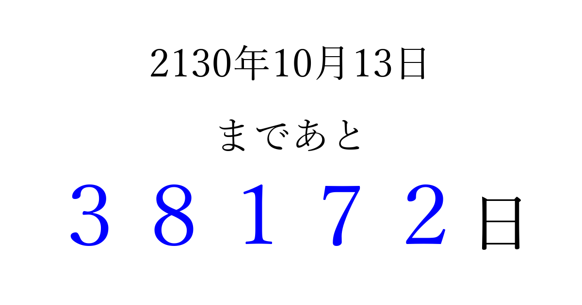 2130年10月13日(金)まで あと 99999 日です 追加すると、トップページからすぐ選べるようになります ※2026/04/09現在の結果です。 最新の状態に更新する ↓シェアして、タイムライン上にカウントダウンを表示しよう!↓ 📤 この結果を共有する Tweet シェア Threads Bluesky 別の日付でカウントダウン 2130年10月のカレンダー このページをブックマークに追加すると、いつでもカウントダウンを確認できます。 (PC: Ctrl+D / Mac: ⌘+D) hitome-notes.comでは以下のページも運営しています。 指定日と期間から日付を計算 | ガチャ確率計算・シミュレーション | プライバシー・ポリシー 運営者:Avocado