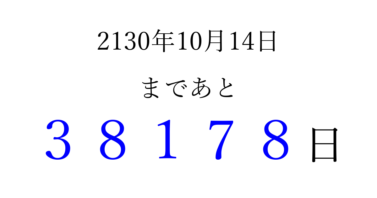 2130年10月14日(土)まで あと 99999 日です 追加すると、トップページからすぐ選べるようになります ※2026/04/04現在の結果です。 最新の状態に更新する ↓シェアして、タイムライン上にカウントダウンを表示しよう!↓ 📤 この結果を共有する Tweet シェア Threads Bluesky 別の日付でカウントダウン 2130年10月のカレンダー このページをブックマークに追加すると、いつでもカウントダウンを確認できます。 (PC: Ctrl+D / Mac: ⌘+D) hitome-notes.comでは以下のページも運営しています。 指定日と期間から日付を計算 | ガチャ確率計算・シミュレーション | プライバシー・ポリシー 運営者:Avocado