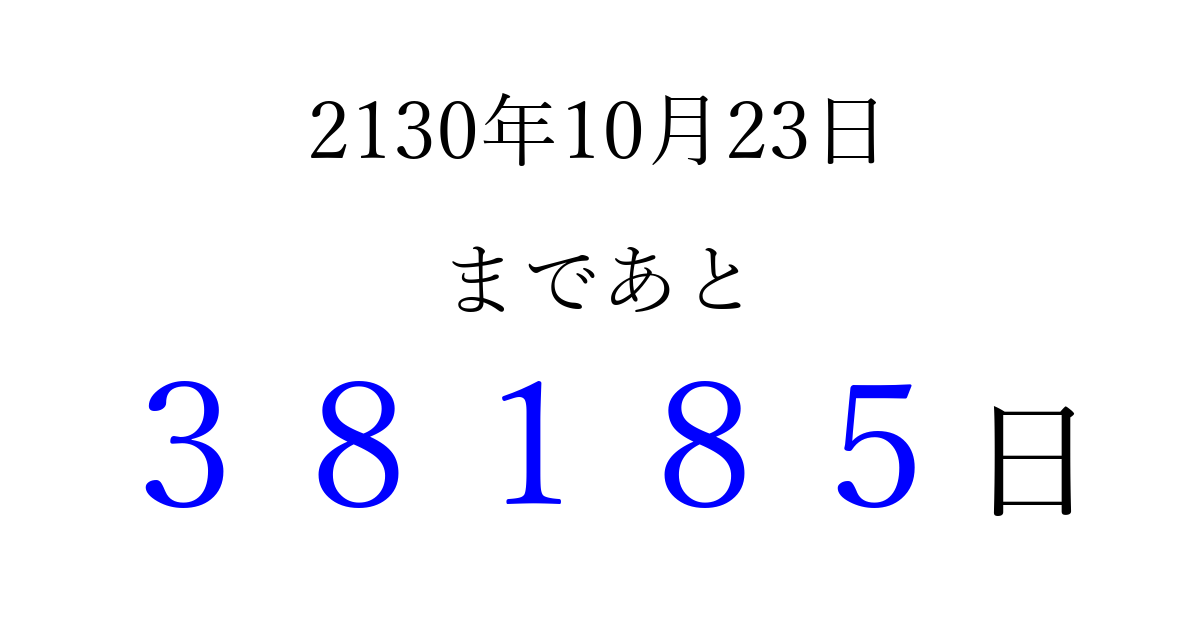 2130年10月23日(月)まで あと 99999 日です 追加すると、トップページからすぐ選べるようになります ※2026/04/06現在の結果です。 最新の状態に更新する ↓シェアして、タイムライン上にカウントダウンを表示しよう!↓ 📤 この結果を共有する Tweet シェア Threads Bluesky 別の日付でカウントダウン 2130年10月のカレンダー このページをブックマークに追加すると、いつでもカウントダウンを確認できます。 (PC: Ctrl+D / Mac: ⌘+D) hitome-notes.comでは以下のページも運営しています。 指定日と期間から日付を計算 | ガチャ確率計算・シミュレーション | プライバシー・ポリシー 運営者:Avocado