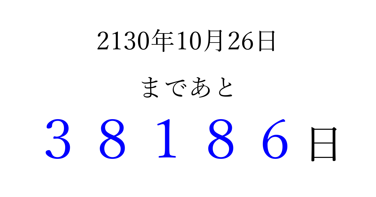 2130年10月26日(木)まで あと 99999 日です 追加すると、トップページからすぐ選べるようになります ※2026/04/08現在の結果です。 最新の状態に更新する ↓シェアして、タイムライン上にカウントダウンを表示しよう!↓ 📤 この結果を共有する Tweet シェア Threads Bluesky 別の日付でカウントダウン 2130年10月のカレンダー このページをブックマークに追加すると、いつでもカウントダウンを確認できます。 (PC: Ctrl+D / Mac: ⌘+D) hitome-notes.comでは以下のページも運営しています。 指定日と期間から日付を計算 | ガチャ確率計算・シミュレーション | プライバシー・ポリシー 運営者:Avocado