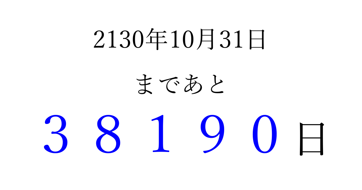 2130年10月31日(火)まで あと 99999 日です 追加すると、トップページからすぐ選べるようになります ※2026/04/09現在の結果です。 最新の状態に更新する ↓シェアして、タイムライン上にカウントダウンを表示しよう!↓ 📤 この結果を共有する Tweet シェア Threads Bluesky 別の日付でカウントダウン 2130年10月のカレンダー このページをブックマークに追加すると、いつでもカウントダウンを確認できます。 (PC: Ctrl+D / Mac: ⌘+D) hitome-notes.comでは以下のページも運営しています。 指定日と期間から日付を計算 | ガチャ確率計算・シミュレーション | プライバシー・ポリシー 運営者:Avocado