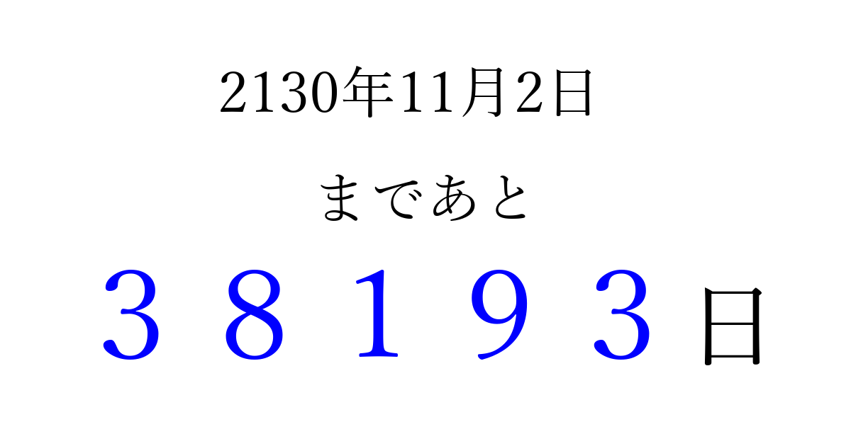 2130年11月2日(木)まで あと 99999 日です 追加すると、トップページからすぐ選べるようになります ※2026/04/08現在の結果です。 最新の状態に更新する ↓シェアして、タイムライン上にカウントダウンを表示しよう!↓ 📤 この結果を共有する Tweet シェア Threads Bluesky 別の日付でカウントダウン 2130年11月のカレンダー このページをブックマークに追加すると、いつでもカウントダウンを確認できます。 (PC: Ctrl+D / Mac: ⌘+D) hitome-notes.comでは以下のページも運営しています。 指定日と期間から日付を計算 | ガチャ確率計算・シミュレーション | プライバシー・ポリシー 運営者:Avocado