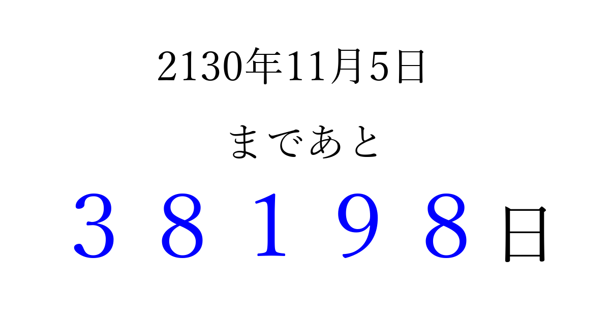 2130年11月5日(日)まで あと 99999 日です 追加すると、トップページからすぐ選べるようになります ※2026/04/06現在の結果です。 最新の状態に更新する ↓シェアして、タイムライン上にカウントダウンを表示しよう!↓ 📤 この結果を共有する Tweet シェア Threads Bluesky 別の日付でカウントダウン 2130年11月のカレンダー このページをブックマークに追加すると、いつでもカウントダウンを確認できます。 (PC: Ctrl+D / Mac: ⌘+D) hitome-notes.comでは以下のページも運営しています。 指定日と期間から日付を計算 | ガチャ確率計算・シミュレーション | プライバシー・ポリシー 運営者:Avocado