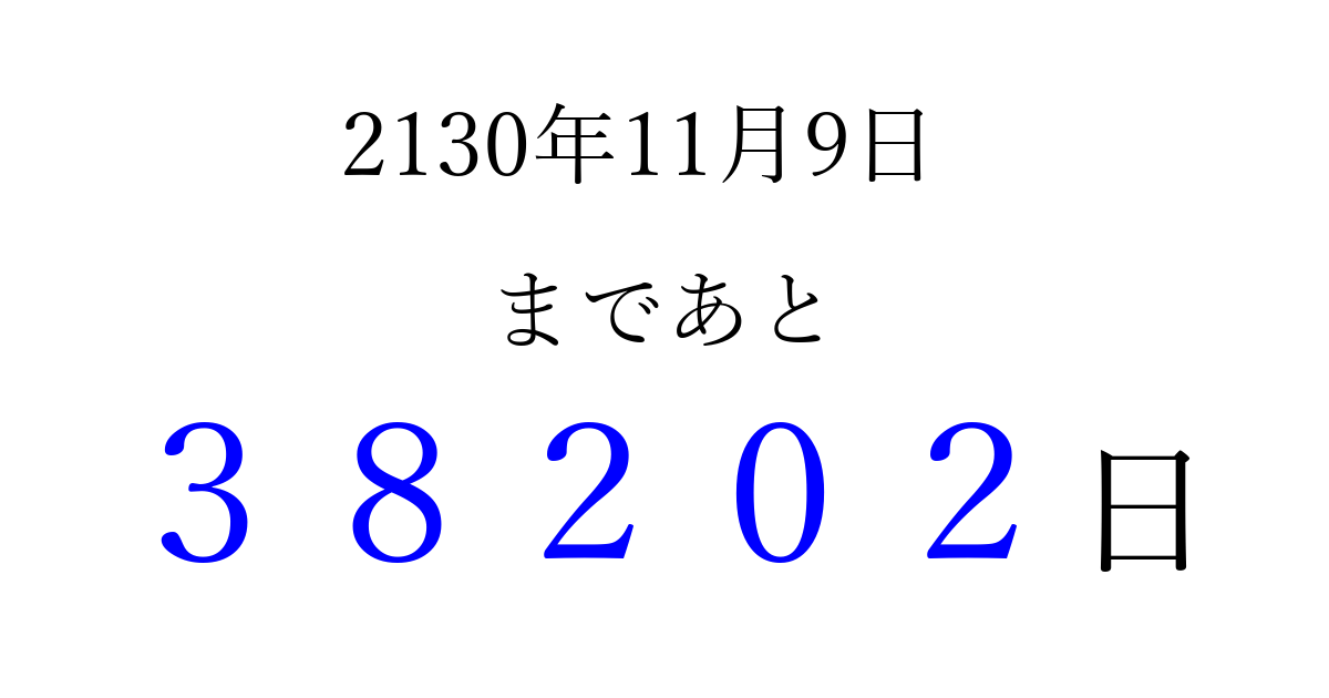 2130年11月9日(木)まで あと 99999 日です 追加すると、トップページからすぐ選べるようになります ※2026/04/06現在の結果です。 最新の状態に更新する ↓シェアして、タイムライン上にカウントダウンを表示しよう!↓ 📤 この結果を共有する Tweet シェア Threads Bluesky 別の日付でカウントダウン 2130年11月のカレンダー このページをブックマークに追加すると、いつでもカウントダウンを確認できます。 (PC: Ctrl+D / Mac: ⌘+D) hitome-notes.comでは以下のページも運営しています。 指定日と期間から日付を計算 | ガチャ確率計算・シミュレーション | プライバシー・ポリシー 運営者:Avocado