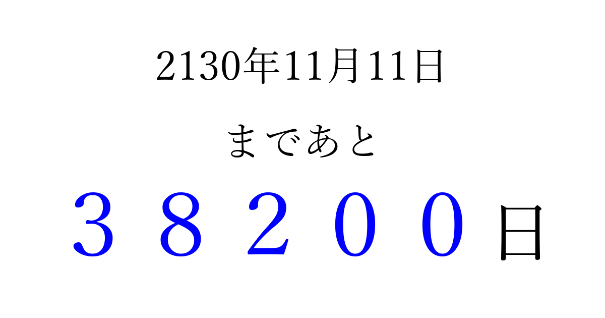 2130年11月11日(土)まで あと 99999 日です 追加すると、トップページからすぐ選べるようになります ※2026/04/10現在の結果です。 最新の状態に更新する ↓シェアして、タイムライン上にカウントダウンを表示しよう!↓ 📤 この結果を共有する Tweet シェア Threads Bluesky 別の日付でカウントダウン 2130年11月のカレンダー このページをブックマークに追加すると、いつでもカウントダウンを確認できます。 (PC: Ctrl+D / Mac: ⌘+D) hitome-notes.comでは以下のページも運営しています。 指定日と期間から日付を計算 | ガチャ確率計算・シミュレーション | プライバシー・ポリシー 運営者:Avocado