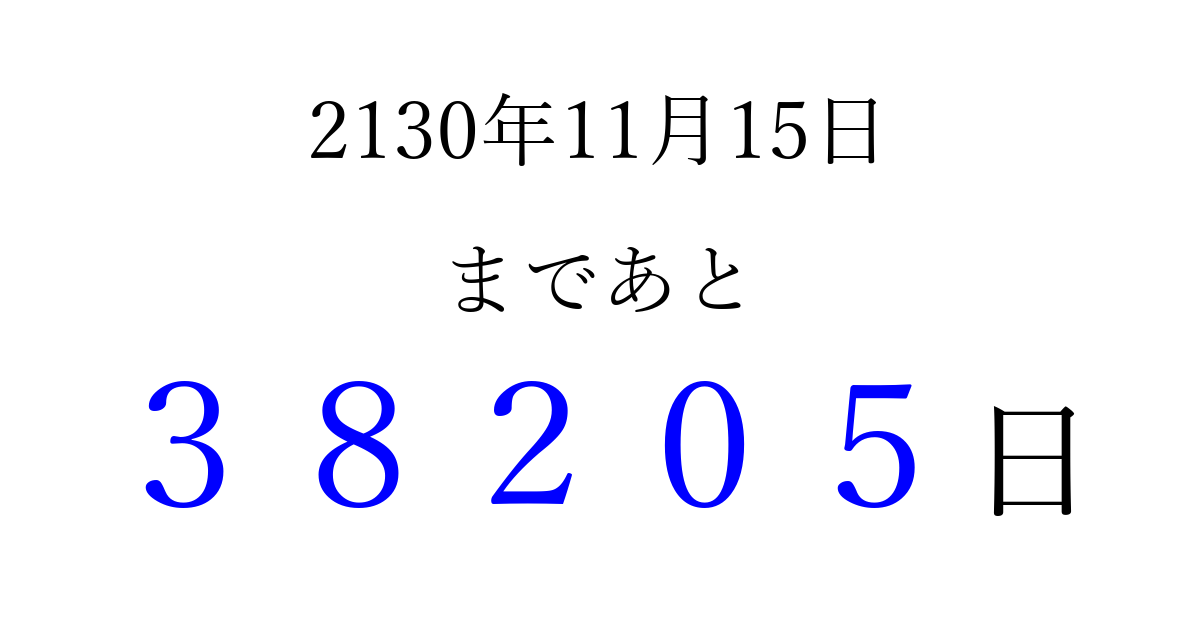 2130年11月15日(水)まで あと 99999 日です 追加すると、トップページからすぐ選べるようになります ※2026/04/09現在の結果です。 最新の状態に更新する ↓シェアして、タイムライン上にカウントダウンを表示しよう!↓ 📤 この結果を共有する Tweet シェア Threads Bluesky 別の日付でカウントダウン 2130年11月のカレンダー このページをブックマークに追加すると、いつでもカウントダウンを確認できます。 (PC: Ctrl+D / Mac: ⌘+D) hitome-notes.comでは以下のページも運営しています。 指定日と期間から日付を計算 | ガチャ確率計算・シミュレーション | プライバシー・ポリシー 運営者:Avocado