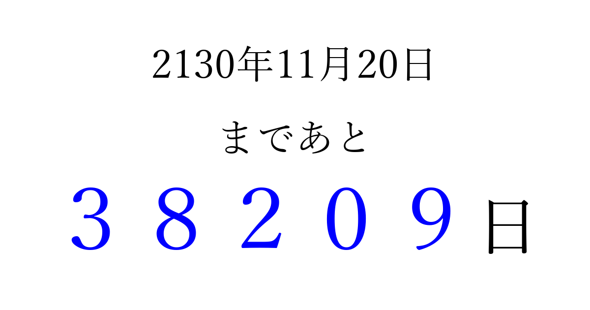 2130年11月20日(月)まで あと 99999 日です 追加すると、トップページからすぐ選べるようになります ※2026/04/10現在の結果です。 最新の状態に更新する ↓シェアして、タイムライン上にカウントダウンを表示しよう!↓ 📤 この結果を共有する Tweet シェア Threads Bluesky 別の日付でカウントダウン 2130年11月のカレンダー このページをブックマークに追加すると、いつでもカウントダウンを確認できます。 (PC: Ctrl+D / Mac: ⌘+D) hitome-notes.comでは以下のページも運営しています。 指定日と期間から日付を計算 | ガチャ確率計算・シミュレーション | プライバシー・ポリシー 運営者:Avocado