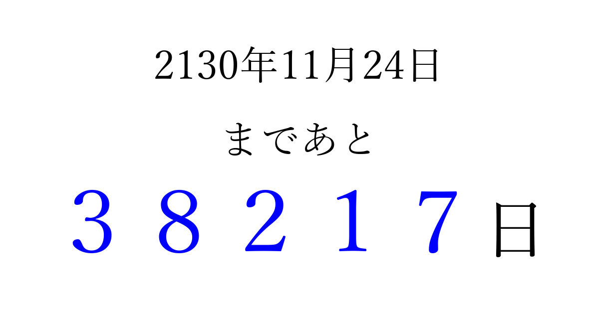 2130年11月24日(金)まで あと 99999 日です 追加すると、トップページからすぐ選べるようになります ※2026/04/06現在の結果です。 最新の状態に更新する ↓シェアして、タイムライン上にカウントダウンを表示しよう!↓ 📤 この結果を共有する Tweet シェア Threads Bluesky 別の日付でカウントダウン 2130年11月のカレンダー このページをブックマークに追加すると、いつでもカウントダウンを確認できます。 (PC: Ctrl+D / Mac: ⌘+D) hitome-notes.comでは以下のページも運営しています。 指定日と期間から日付を計算 | ガチャ確率計算・シミュレーション | プライバシー・ポリシー 運営者:Avocado
