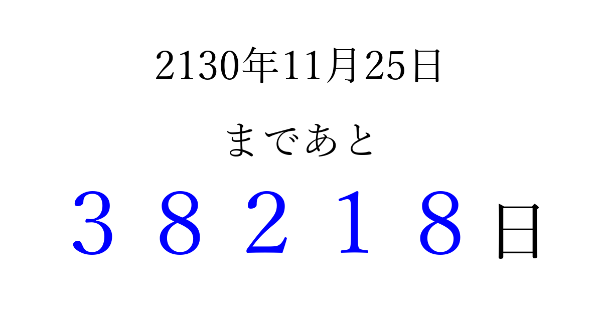 2130年11月25日(土)まで あと 99999 日です 追加すると、トップページからすぐ選べるようになります ※2026/04/06現在の結果です。 最新の状態に更新する ↓シェアして、タイムライン上にカウントダウンを表示しよう!↓ 📤 この結果を共有する Tweet シェア Threads Bluesky 別の日付でカウントダウン 2130年11月のカレンダー このページをブックマークに追加すると、いつでもカウントダウンを確認できます。 (PC: Ctrl+D / Mac: ⌘+D) hitome-notes.comでは以下のページも運営しています。 指定日と期間から日付を計算 | ガチャ確率計算・シミュレーション | プライバシー・ポリシー 運営者:Avocado