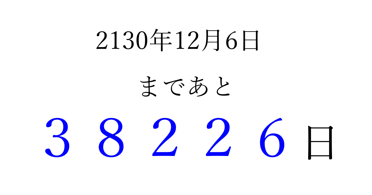 2130年12月6日(水)まで あと 99999 日です 追加すると、トップページからすぐ選べるようになります ※2026/04/09現在の結果です。 最新の状態に更新する ↓シェアして、タイムライン上にカウントダウンを表示しよう!↓ 📤 この結果を共有する Tweet シェア Threads Bluesky 別の日付でカウントダウン 2130年12月のカレンダー このページをブックマークに追加すると、いつでもカウントダウンを確認できます。 (PC: Ctrl+D / Mac: ⌘+D) hitome-notes.comでは以下のページも運営しています。 指定日と期間から日付を計算 | ガチャ確率計算・シミュレーション | プライバシー・ポリシー 運営者:Avocado