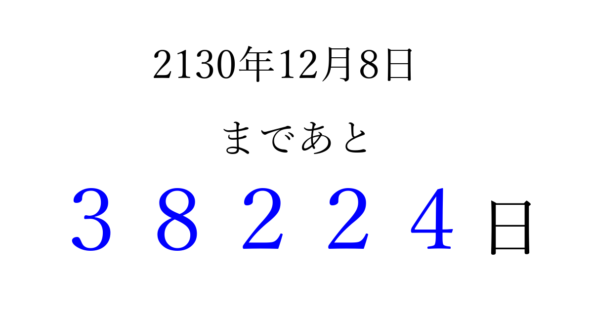 2130年12月8日(金)まで あと 99999 日です 追加すると、トップページからすぐ選べるようになります ※2026/04/13現在の結果です。 最新の状態に更新する ↓シェアして、タイムライン上にカウントダウンを表示しよう!↓ 📤 この結果を共有する Tweet シェア Threads Bluesky 別の日付でカウントダウン 2130年12月のカレンダー このページをブックマークに追加すると、いつでもカウントダウンを確認できます。 (PC: Ctrl+D / Mac: ⌘+D) hitome-notes.comでは以下のページも運営しています。 指定日と期間から日付を計算 | ガチャ確率計算・シミュレーション | プライバシー・ポリシー 運営者:Avocado